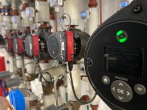 In een grote container op het dak stond een verouderde verwarmingsketel, dit is nu een cascadeopstelling met drie kleinere ketels, welke ook geschikt zijn voor een eventueel toekomstige bijmenging van waterstof! Naast deze ketels hebben we een warmtepompinstallatie geïnstalleerd om duurzame energie te genereren. Twee dikke pijpen lopen van het dak door een schacht naar de kelder en gaan naar de verdeler. Deze verdeler zorgt ervoor dat het warme water naar verschillende groepen per verdieping wordt verdeeld, waaronder de begane grond, de eerste verdieping met kantoren, en andere verdiepingen met verschillende functies. De oude pomp werkte continu, zelfs als het niet nodig was. De nieuwe duurzame pomp werkt echter alleen wanneer er vraag naar is, wat aanzienlijk veel energie bespaart.